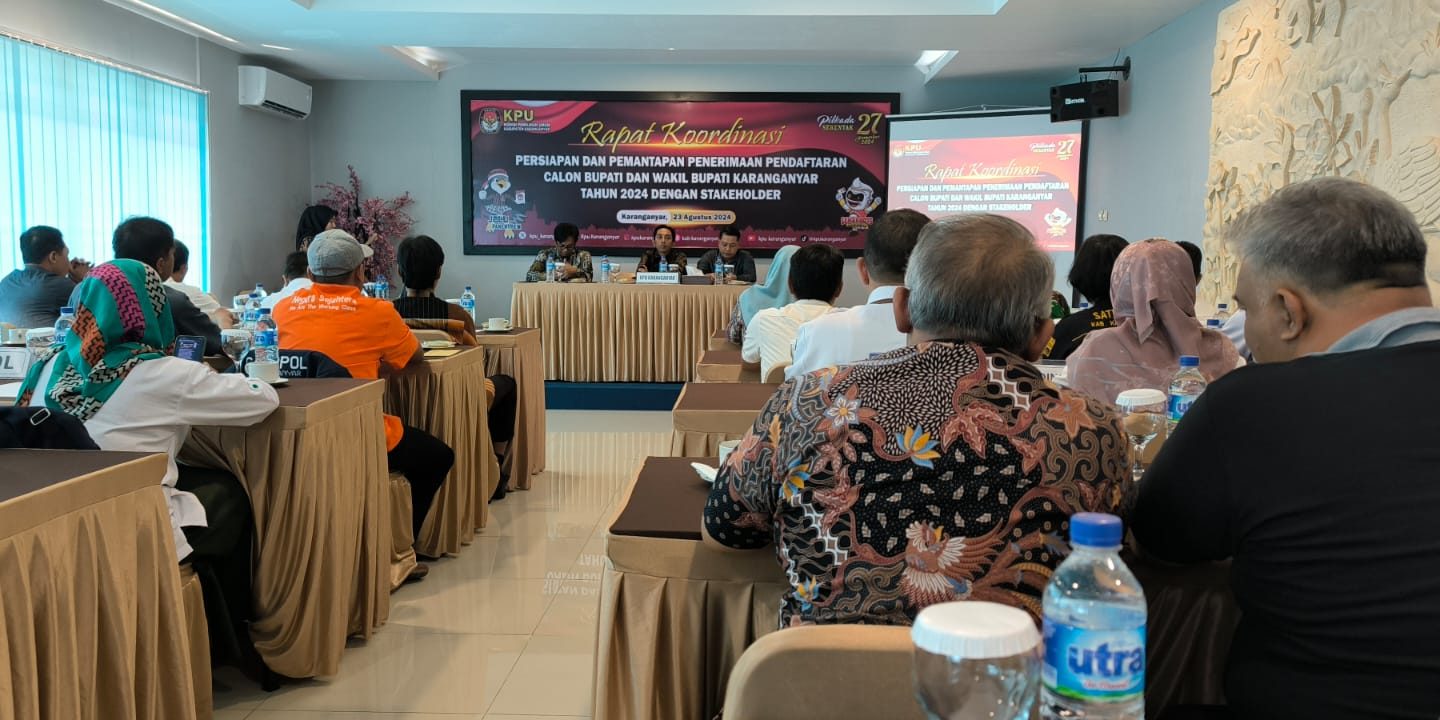Pada hari Jumat, 23 Agustus 2024, bertempat di Ruang Kebon Dalem Papahan, telah dilaksanakan Rapat Koordinasi dalam rangka persiapan dan pemantapan pelaksanaan penerimaan pendaftaran calon Bupati dan Wakil Bupati Karanganyar Tahun 2024. Rapat yang dimulai pukul 09.00 WIB ini dihadiri oleh berbagai stakeholder terkait, di antaranya Komisioner KPU, Baperlitbang, Satpol PP, Bakesbangpol, Sekwan, Dinas Pendidikan, BKPSDM, Dispermades, Bagian Pemerintahan Setda, Kemenag, Polres, Kodim, serta perwakilan partai politik.