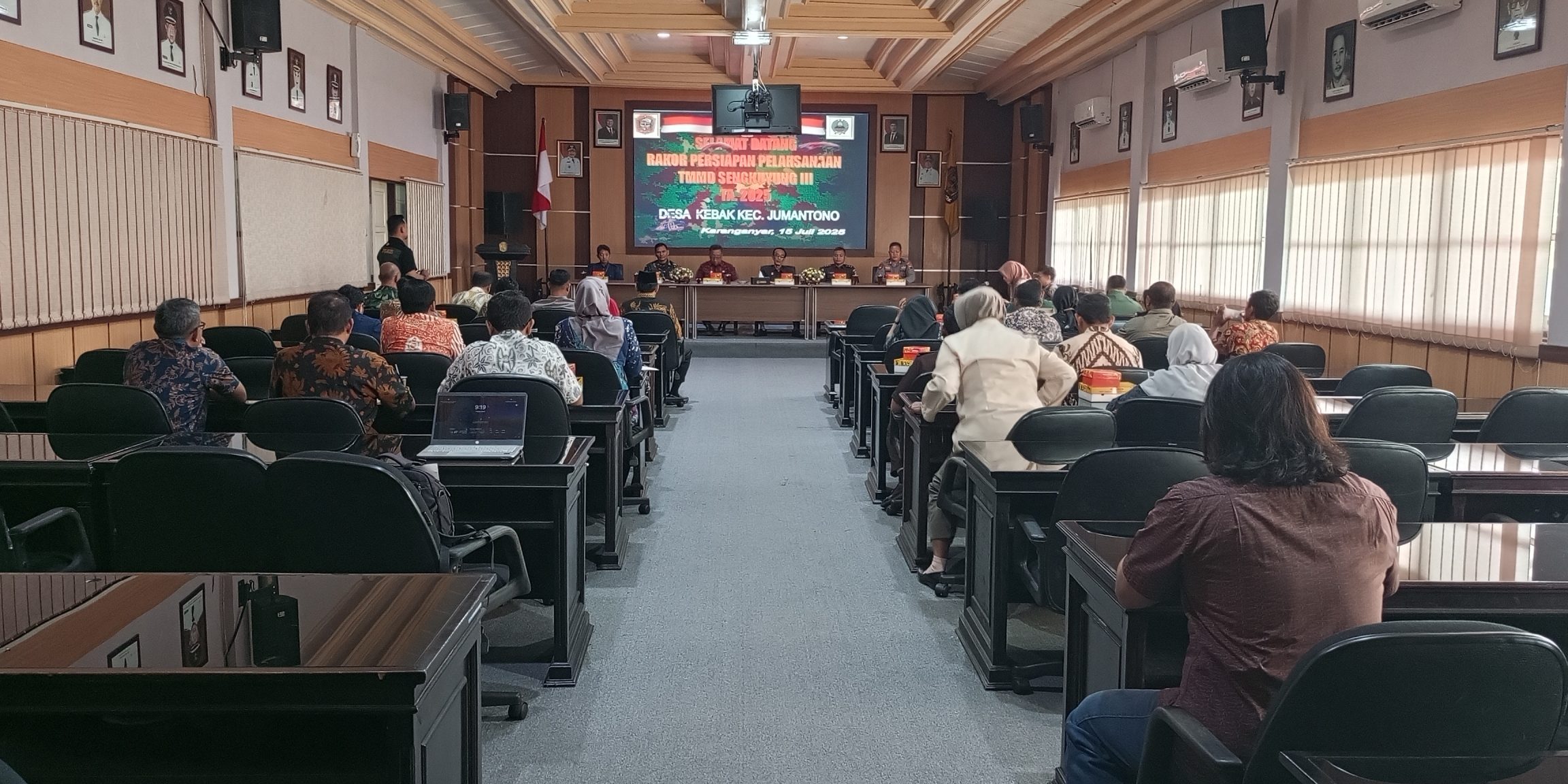 Kegiatan TMMD Sengkuyung Tahap III Tahun 2025 direncanakan berlangsung di Desa Kebak, Kecamatan Jumantono, dengan fokus pembangunan fisik dan pemberdayaan masyarakat. Dalam rapat ini juga disampaikan pemaparan teknis, pembagian peran lintas sektor, serta penajaman agenda pelaksanaan TMMD agar berjalan sesuai sasaran.